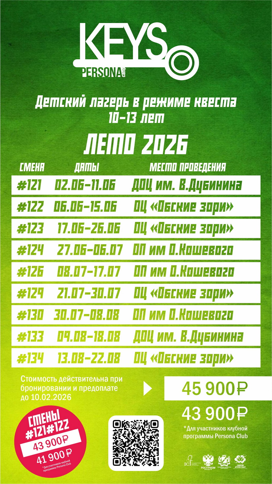 • Смены реализуются на базе Оздоровительного центра "Обские зори", Образовательного парка им О.Кошевого, Детского оздоровительного центра им. В. Дубинина, Базы спорта и отдыха "Тандэм"